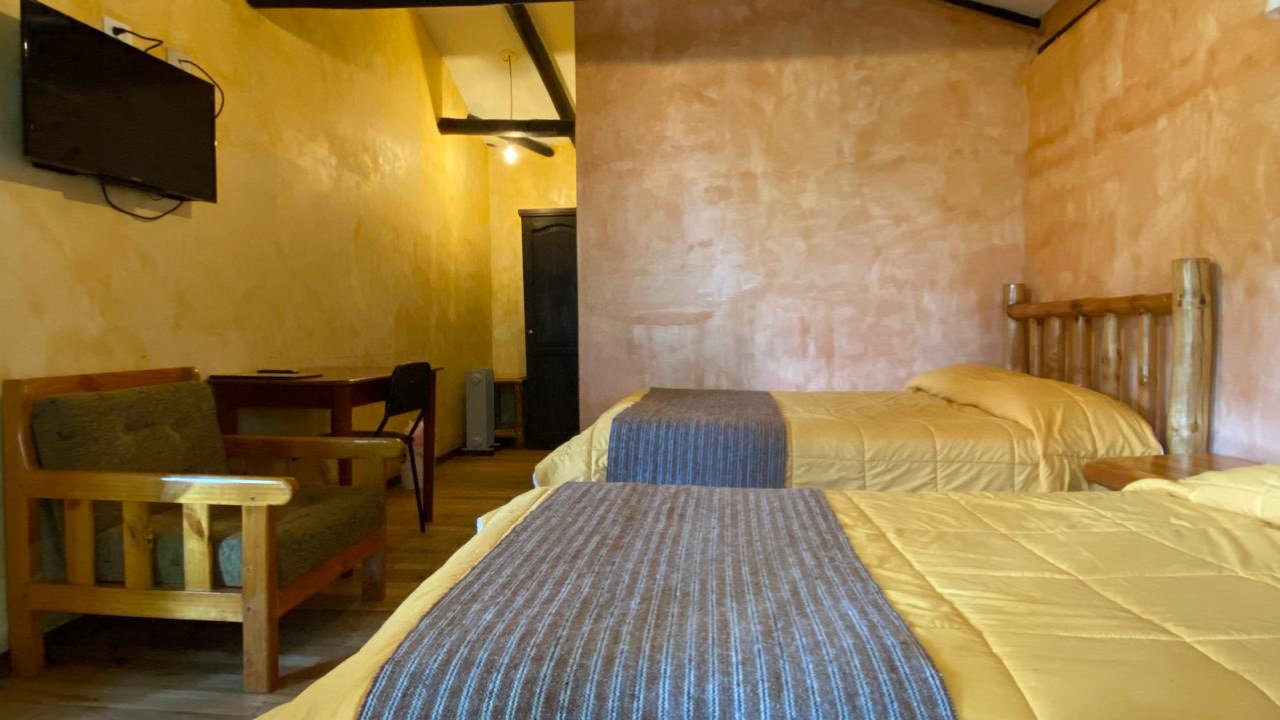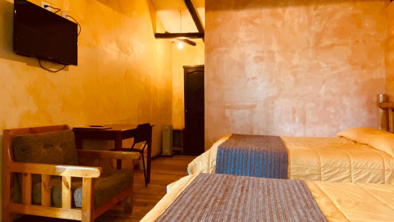 Cómoda habitación matrimonial ubicada en el primer piso, con vistas cruzadas al norte y este de la ciudad. Un espacio cálido y equilibrado que combina tradición, confort y funcionalidad.