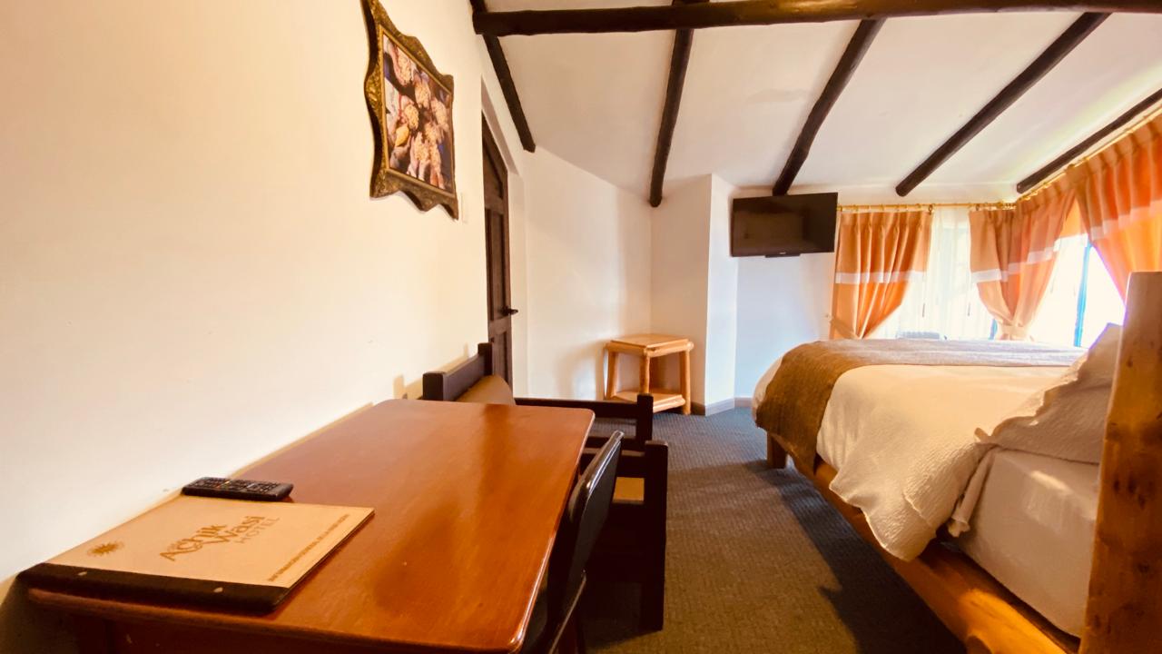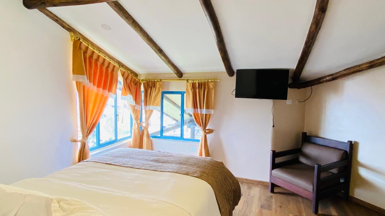 Cómoda habitación matrimonial ubicada en el primer piso, con vistas cruzadas al norte y este de la ciudad. Un espacio cálido y equilibrado que combina tradición, confort y funcionalidad.